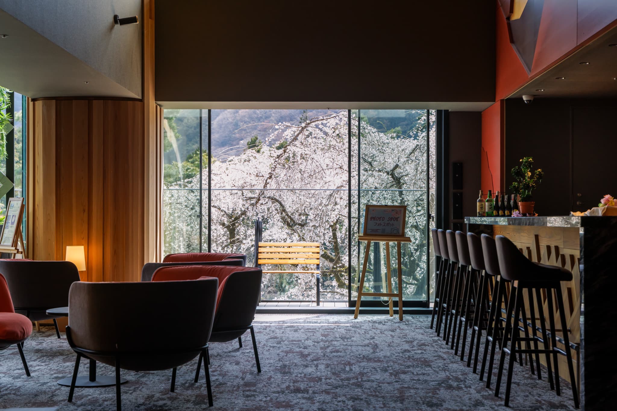 ロビーから眺める枝垂れ桜が満開を迎えております!フォトスポットもご用意しています。
