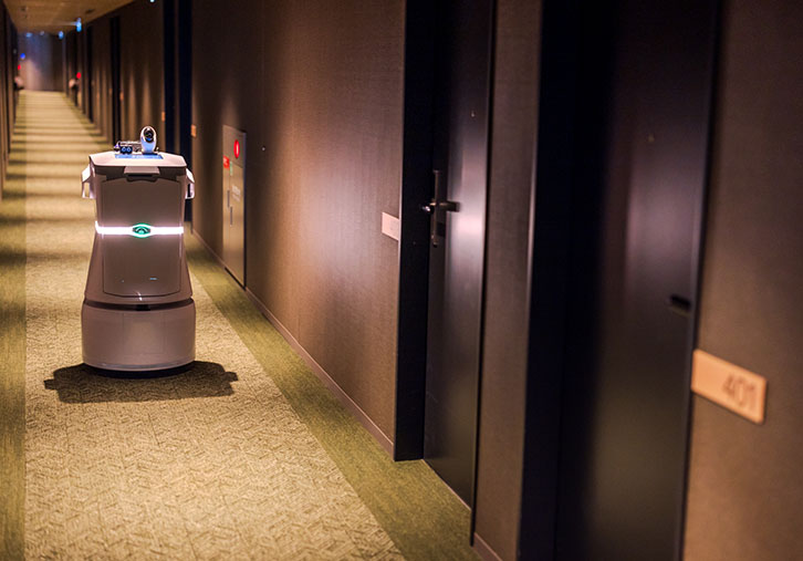 - 로비에서 엘리베이터 승하차는 물론, 고객님의 객실 앞까지 장애물을 피해 가며 모든 경로를 자동으로 이동하는 자율주행형 로봇입니다. 고객님께서 주문하신 물품을 객실까지 정성스럽게 전달해 드립니다.